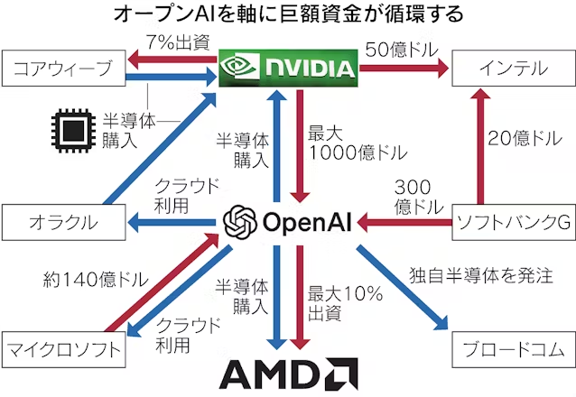 つまり、簡単な話がA社がB社に1000億円を投資して、B社がC社にデータセンター建設でその1000億円を使って依頼して、C社がA社にデータセンターで使われるチップやメモリなどを依頼された1000億円で発注するという構図です。全体を見てみると、1000億円しか動いていないのに、各社の売り上げはうなぎ登りに成長しているように見えるのが、循環取引です。それが、今のアメリカのAIテック企業たちで行われています。